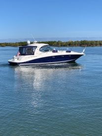 Designed for comfort and convenience, the boat is equipped with air conditioning, a top-of-the-line audio system, a fishfinder, and a refrigerator to keep your drinks cold. Enjoy both indoor and outdoor spaces with inside and outside speakers, a bow and aft sundeck, and a bathing platform for easy access to the water.