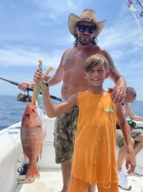 A Latte Fun Fishing is a 2004 Glacier Bay 260 canyon runner Center console based out of Pensacola. It can take up to six guests. The boat is powered by two 150 HP gasoline outboard Yamaha engines, offering a maximum cruising speed of 30 knots. The vessel comes equipped with audio system, baitwell, fishfinder, outside speakers and rod holders.