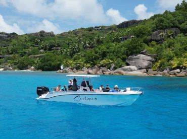 Surfari Ventures invites you to explore the crystal-clear waters of Praslin aboard a beautifully restored 2017 Larue Glass Super Seadog Center Console (restored in 2023). Based in Baie Sainte Anne, this spacious vessel accommodates up to fourteen guests and is powered by twin 140 HP Suzuki outboards, delivering smooth cruising at up to 20 knots.