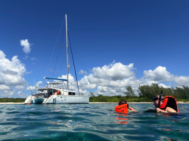 Chapter Two is a 2014 Lagoon 450 Catamaran based out of Puerto Aventuras. It can take up to thirty guests. The boat is powered by two 49 HP diesel inboard Yanmar engines, offering a maximum cruising speed of 8 knots. The vessel comes equipped with air conditioning, audio system, grill, ice box, inside speakers, outside speakers, refrigerator and rod holders.