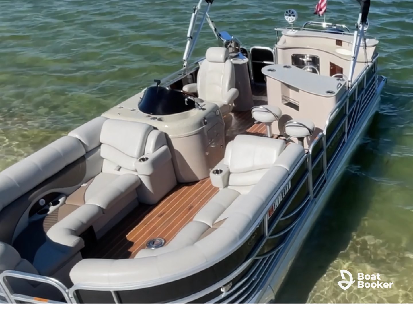 Onboard amenities include a premium audio system, inside speakers, and a convenient grill for fresh meals. For your comfort, a bimini provides shade. Optional items are available upon request and are free of charge including: Large floating mat, cooler with ice, inflatables, beach chairs, cornhole set, snorkel gear, and noodles, so you can explore the crystal-clear waters in style.