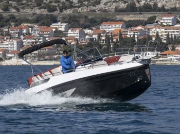 Experience the magic of Trogir and its surrounding islands aboard BlueMotion – Abaris 23, a brand-new 2025 center console designed for unforgettable adventures. This sleek boat accommodates up to ten guests and is powered by a robust 300 HP Yamaha engine, cruising smoothly at speeds up to 40 knots – perfect for fast island hopping and exploring hidden coves.