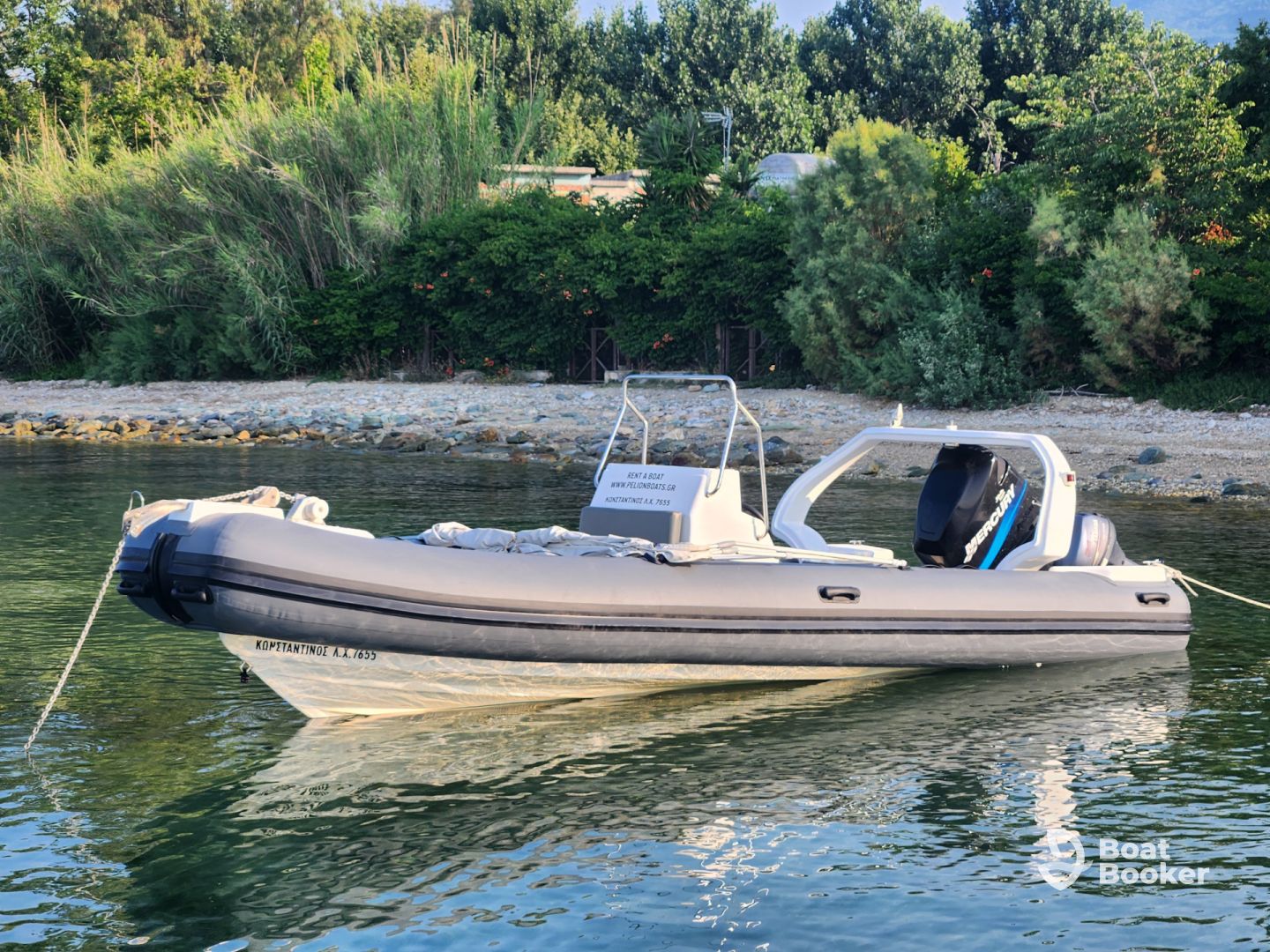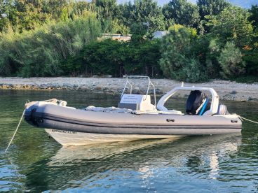 Explore the stunning waters of Volos with Pelion Boats, a beautifully restored 2006 Hellas 6.4 Inflatable, upgraded in 2024 for your ultimate comfort. This versatile vessel accommodates up to eight guests and is powered by a reliable 200 HP Mercury outboard engine, cruising smoothly at speeds up to 32 knots. Relax on the spacious aft sundeck, enjoy your favorite playlists with the onboard audio system, and keep your drinks perfectly chilled in the ice box.