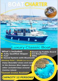 Comino charters is a Luxury British classic baat restored in 2025), based out of Msida. It can take up to twelve guests. The boat is powered by diesel inboard engines, offering a maximum cruising speed of 12 knots. The vessel comes equipped with audio system with bluetooth fishfinder, BBQ grill, ice box, inside speakers, outside speakers and rod holders.