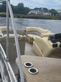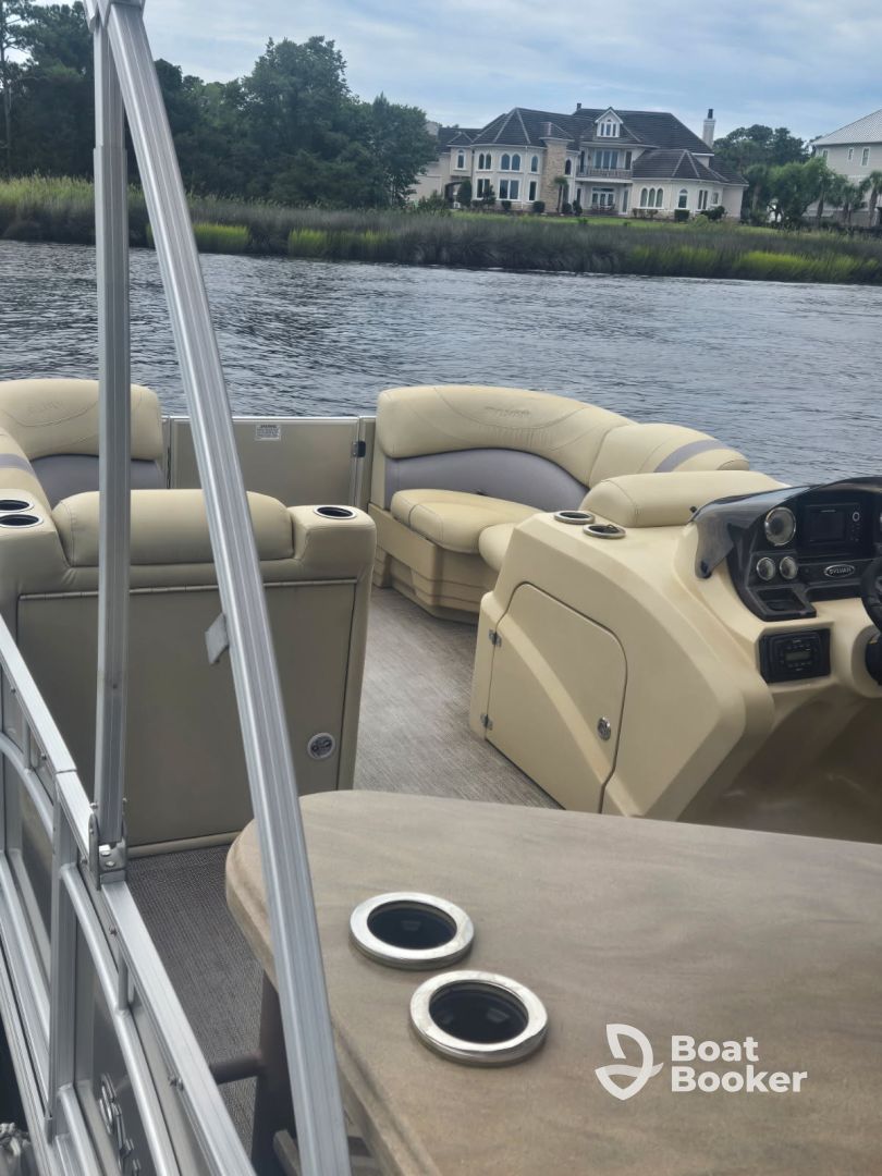 Equipped with a wet bar, front and rear loungers, bar stools, audio system, and outside speakers, this pontoon is perfect for a relaxing day on the Intracoastal Waterway in Little River.