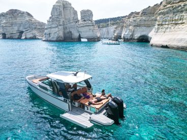 Designed for both adventure and relaxation, the Poseidon features a bimini, bow and aft sundecks, a bathing platform, one cabin, and a toilet, plus an audio system with indoor and outdoor speakers and a refrigerator to keep your refreshments cool.