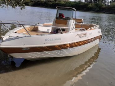 FIRST CLASS BOAT RENTAL is a 2020 Yacht&co Voyage 18 Center console (restored in 2025), based out of Venezia. It can take up to seven guests. The boat is powered by one 40 HP gasoline outboard Parsun engine, offering a maximum cruising speed of 15 knots. The vessel comes equipped with audio system, fishfinder and outside speakers.