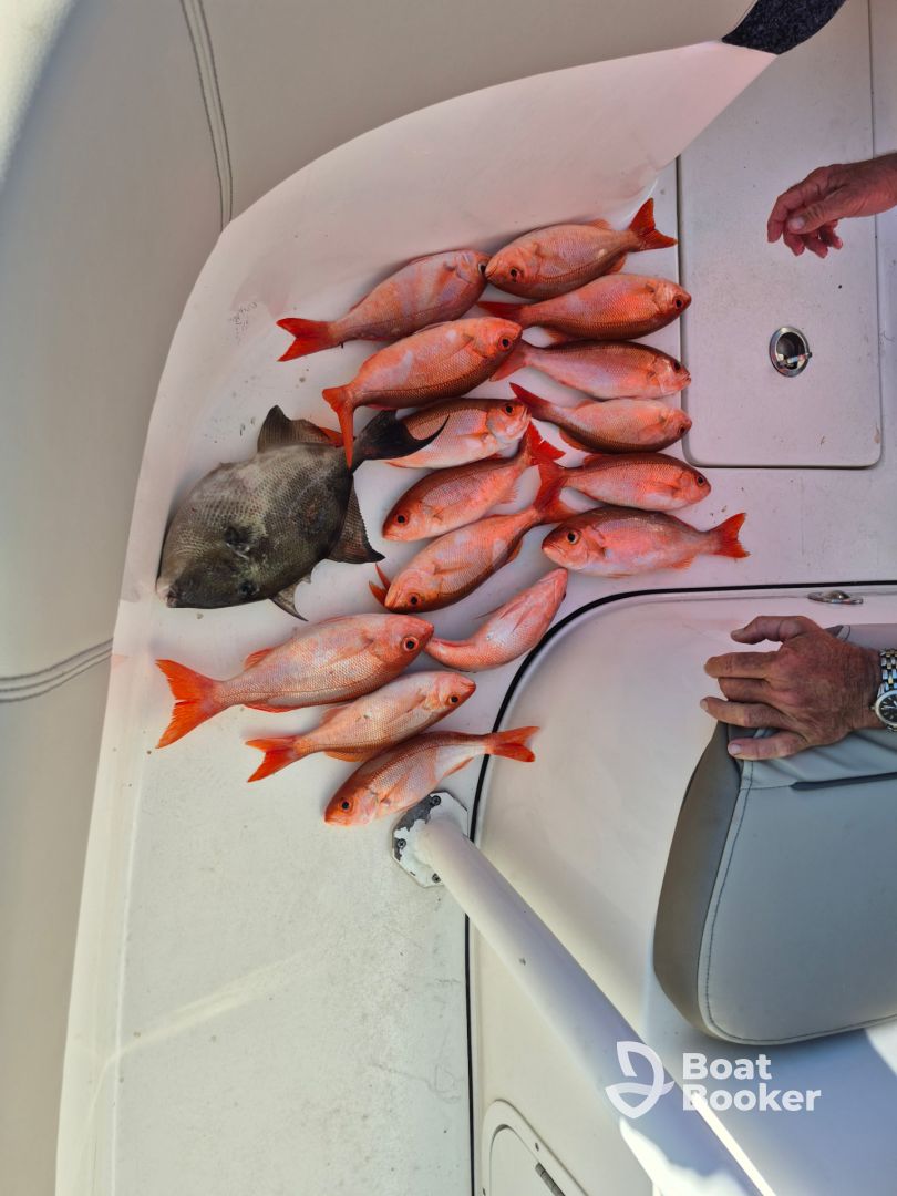 Onboard, you’ll enjoy a comfortable bow sundeck, a fully equipped head, and one toilet, along with amenities like an audio system, baitwell, fishfinder, rod holders, and outside speakers. Optional drinks and snacks can be added to make your outing even more enjoyable.