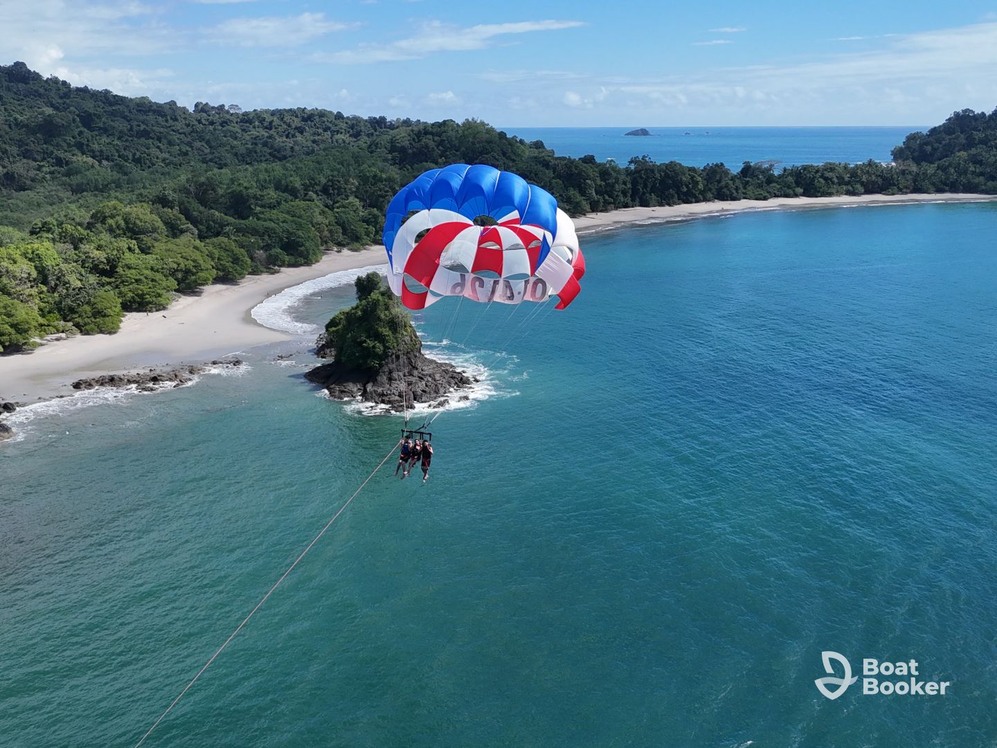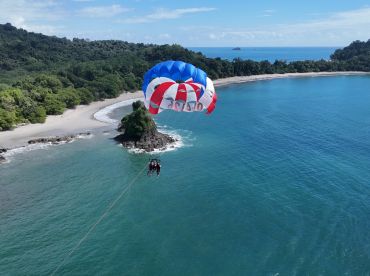 Parasailing is a unique and exhilarating experience with Aguas Azules! First, you will receive a brief overview of the process and what to expect. Next, you will be fitted with a harness and a life vest. You will then be hooked up to the parachute and given step-by-step instructions for flying. You will take a few steps on the beach and effortlessly float up into the air. During your ride, you will feel like a bird as you fly along the stunning Manuel Antonio coastline, enjoying picturesque views of Manuel Antonio National Park, Espadilla Beach, and various small islands along the coast. You will finish by gently lowering into the warm, inviting, and refreshing Pacific Ocean, where guides on a wave runner are waiting for you to help you disconnect from the equipment and transport you back to the shore. The whole process will take about one hour.
