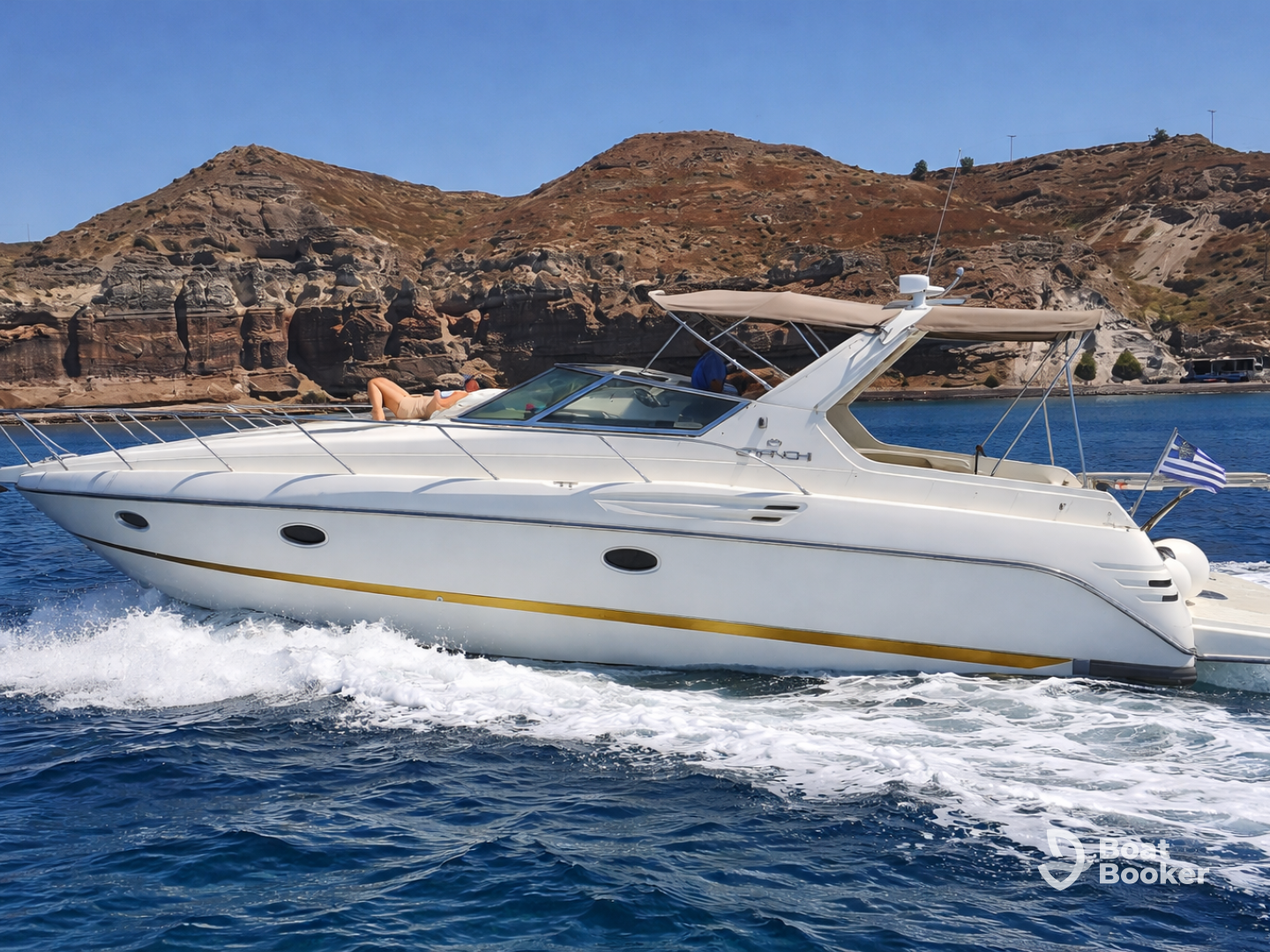 As the day winds down, watch the world-famous Santorini sunset from the best vantage point on the island — the deck of your private yacht. With comfortable seating, a bathing platform, flybridge, and full amenities including a kitchen, cabin, and bathroom, this yacht promises an unforgettable escape.