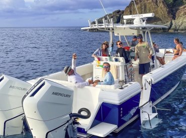 Fun Hog Charters invites you to explore the stunning waters of Estate Bovoni aboard a beautifully restored 2006 Intrepid 370 Center Console. Fully upgraded in 2018, this 37-foot vessel combines performance, comfort, and style—perfect for groups of up to twelve guests. Powered by twin 400 HP Mercury engines, she cruises smoothly at up to 35 knots, ensuring both speed and stability on the water.