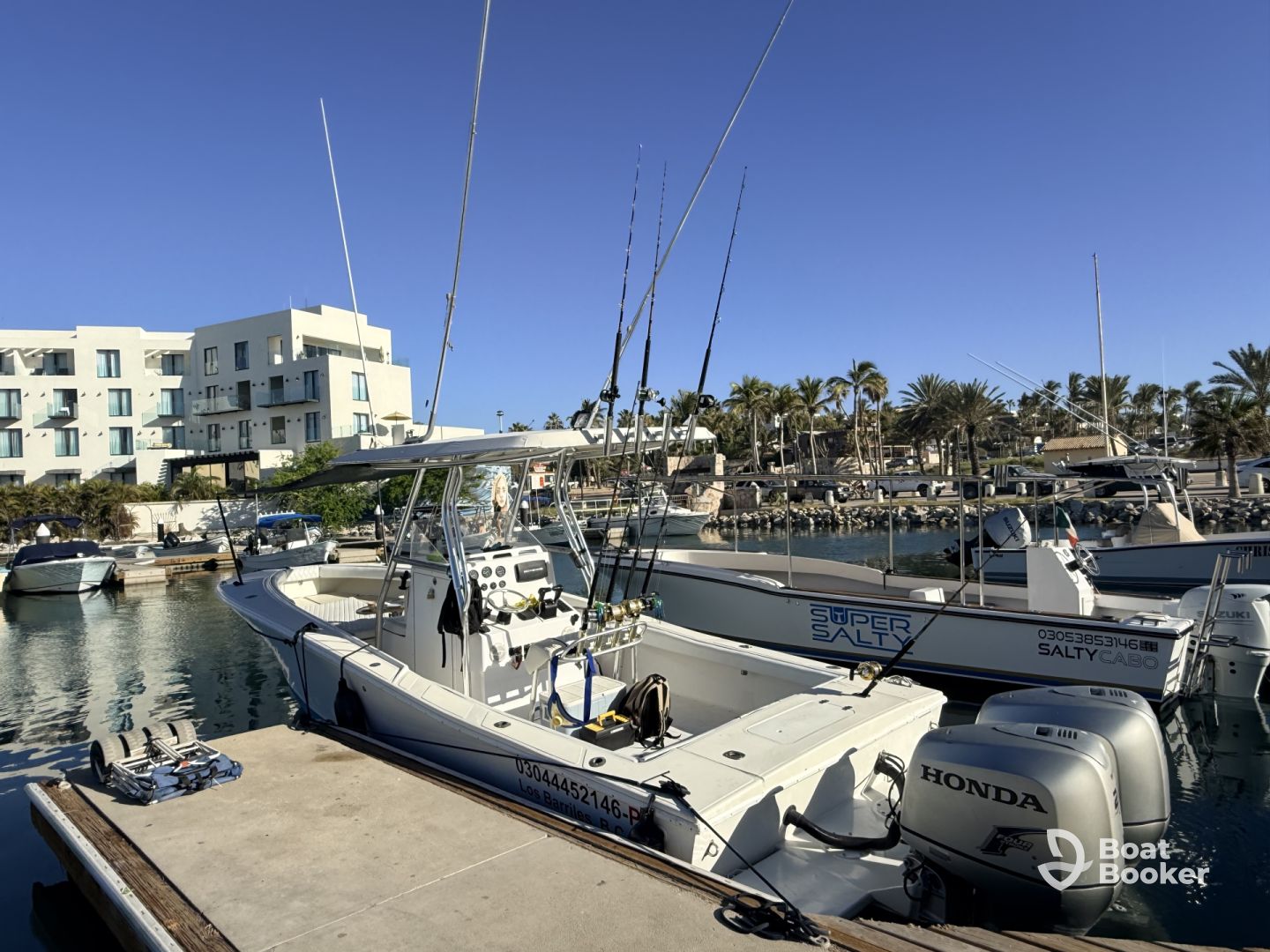 Experience the ultimate adventure on the Sofia Moana Charter, a fully restored 2002 Ocean Runner 27ft Center Console, refreshed in 2025 and ready to explore the stunning waters of San Jose del Cabo. Perfect for up to six guests, this sleek vessel combines speed, comfort, and style. Powered by twin 225 HP Honda outboard engines, you can cruise at speeds up to 30 knots, making every trip thrilling yet smooth.