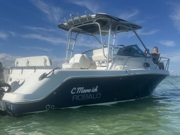 Step aboard the 2014 Robalo R265WA Walkaround, based in Miami, perfect for up to six guests seeking luxury, comfort, and adventure. Powered by twin 250 HP Yamaha outboard engines, this boat reaches speeds up to 30 knots, letting you explore Miami Bay, Star Island, and Key Biscayne with ease.