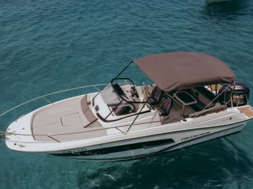 Jeanneau Cap Camarat 7.5 WA Walkaround based out of Eivissa. It can take up to nine guests, skipper included. The boat is powered by one 300 HP gasoline outboard Yamaha engine, offering a maximum cruising speed of 38 knots. The vessel comes equipped with audio system, ice box and outside speakers.