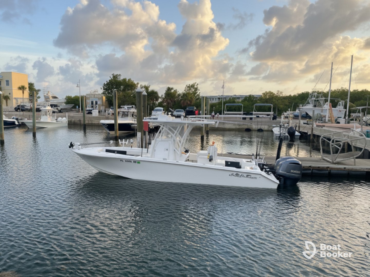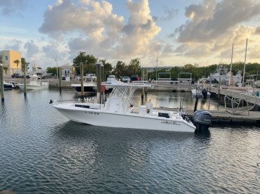 Experience the ultimate Florida boating adventure aboard the 2020 Sea Hunter Floridian Center Console, available through Blue Ocean Yacht Charters in Stock Island. Perfect for up to six guests, this sleek, high-performance vessel is powered by twin 300 HP outboard engines, reaching speeds of up to 40 knots. Whether you're chasing the big catch or exploring hidden coves, you'll have everything you need for a seamless trip, including a baitwell, fishfinder, ice box, and rod holders.