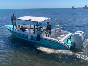 Carpe Diem Charters Belize is a fully restored 2010 Captain Sharks Wahoo Center Console (2025 update), based in San Pedro, perfect for up to ten guests seeking an unforgettable day on the Belizean waters. Powered by twin 150 HP Yamaha outboard engines, the boat cruises comfortably at 16 knots while providing smooth, stable rides for snorkeling, diving, or sightseeing.