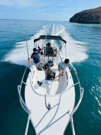 MC YACHTS COMPANY is a 2018 Super Panga Speed Boat Center console (restored in 2023), based out of La Paz. It can take up to four guests. The boat is powered by one 130 HP gasoline outboard HONDA engine, offering a maximum cruising speed of 30 knots. The vessel comes equipped with audio system, baitwell, rod holders and WiFi.