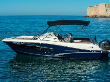 Dubrovnik Blu is a 2016 Jeanneau Cap Camarat 7.5 WA S2 Walkaround based out of Dubrovnik. It can take up to six guests. The boat is powered by one 250 HP gasoline outboard Yamaha engine, offering a maximum cruising speed of 37 knots. The vessel comes equipped with fishfinder, outside speakers, refrigerator, rod holders and WiFi.