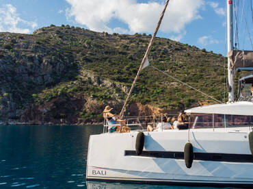 Discover Nafplio from the sea aboard “Calypso”, a spacious Bali 4.1 catamaran designed for comfort, relaxation, and unforgettable moments.