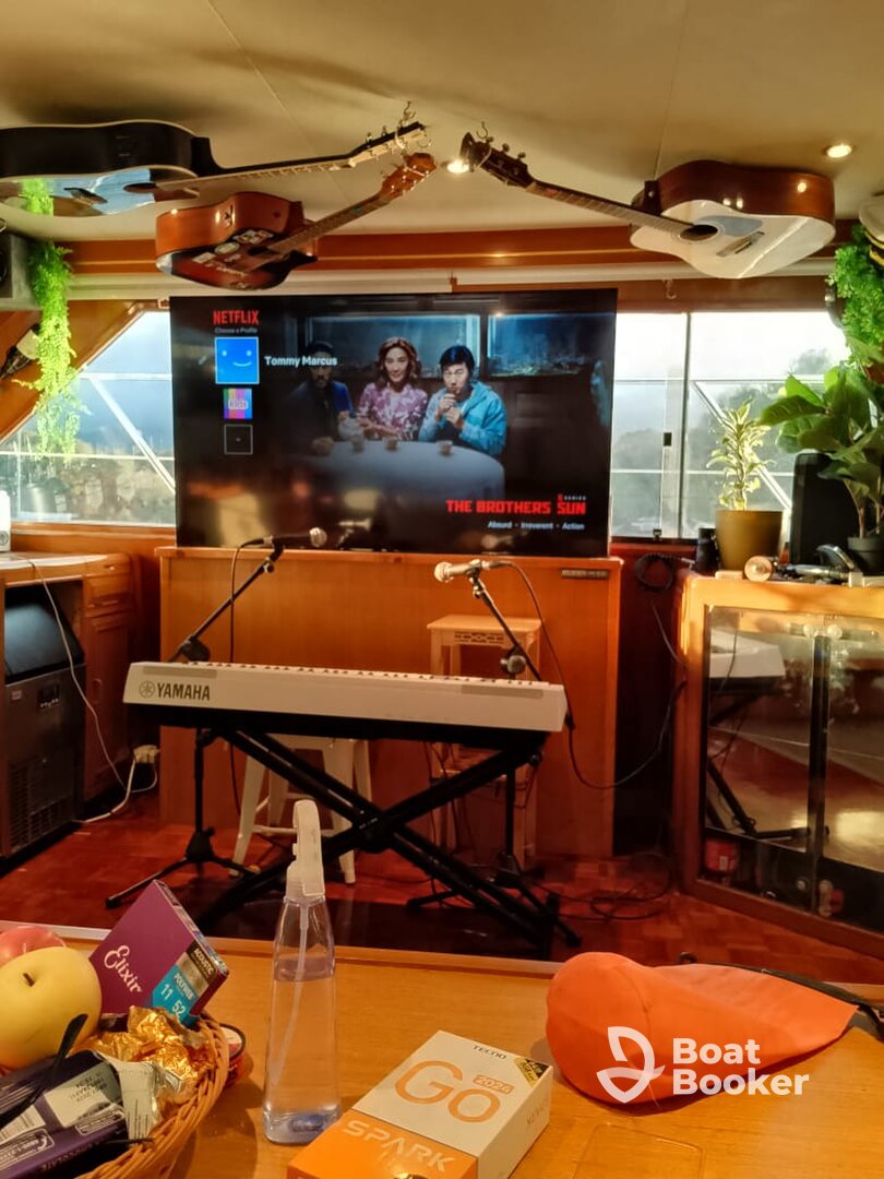You will find all the necessary safety features onboard, the boat features anchor, chart plotter, sonar, GPS, life jackets, radar, VHF radio and wheel steering are included.