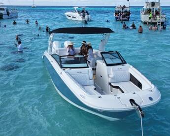 Welcome aboard Sundaze Watersports! Experience luxury on our 2020 Searay 290SXV Dual Console, based in beautiful West Bay. With space for up to twelve guests, you’ll enjoy the thrill of twin 225 HP Mercury outboard engines, cruising at up to 40 knots. Our boat is equipped with an audio system, ice box, and interior speakers for your enjoyment.