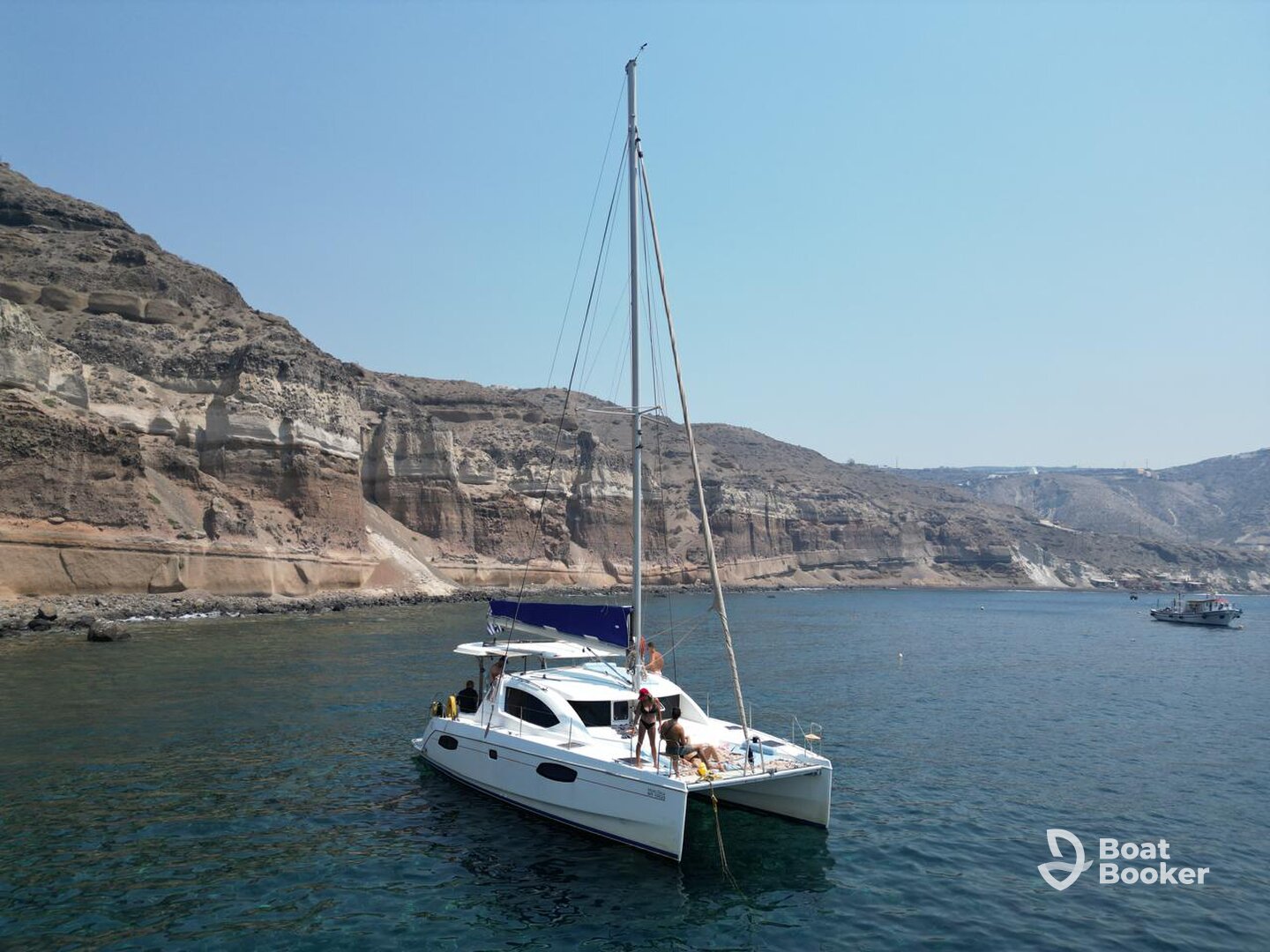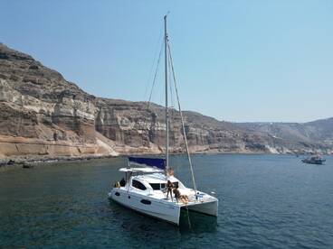 Moby Dick is a 2009 Leopard 40 Catamaran based out of Vlichada. It can take up to sixteen guests. The boat is powered by two 30 HP diesel inboard Yanmar engines, offering a maximum cruising speed of 7 knots. The vessel comes equipped with audio system, grill, inside speakers, outside speakers, refrigerator and WiFi.